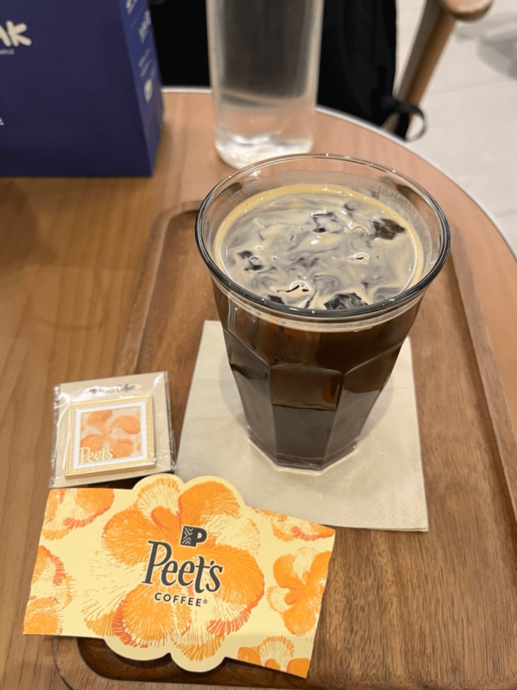 我们点了一杯冰美式,豆子是大航海家,属于中烘。选择 33 元的套餐,除了饮品外,会附送一件 Peet’s Coffe 的冰箱贴。