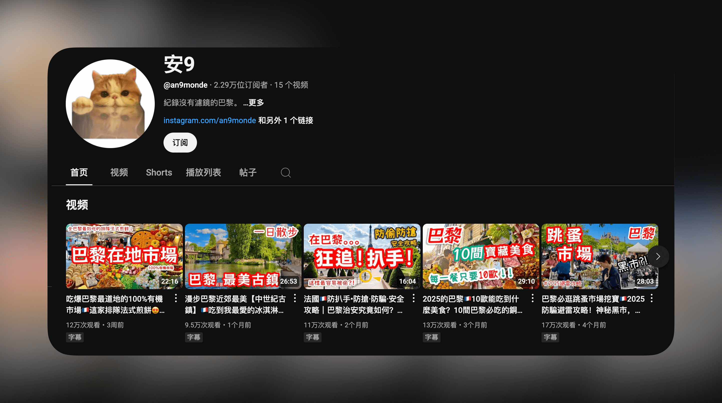最近我们在看一位在法国巴黎的 Youtuber: 安 9